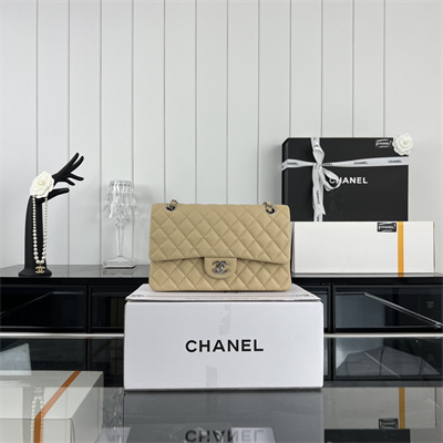 Cha.nel Medium Classic Flap Bag Grained Calfskin Silver Tone Metal Beige 01112