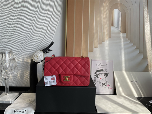 Cha.nel Mini Classic Flap Bag Grained Calfskin Gold Tone Metal Red 01116