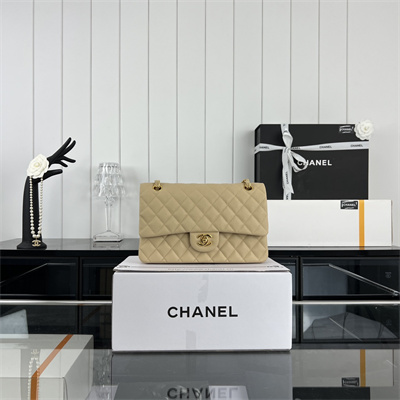 Cha.nel Medium Classic Flap Bag Grained Calfskin Gold Tone Metal Beige 01112