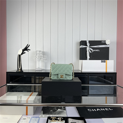 cha.nel S*per mini classic flap bag grained calfskin gold tone metal lt green 01115