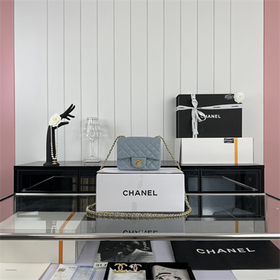 cha.nel S*per mini classic flap bag grained calfskin gold tone metal lt blue 01115