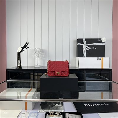 Cha.nel Mini Classic Flap Bag Grained Calfskin Gold Tone Metal Red 01116