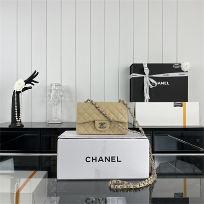 Cha.nel Mini Classic Flap Bag Grained Calfskin Silver Tone Metal Beige 01116