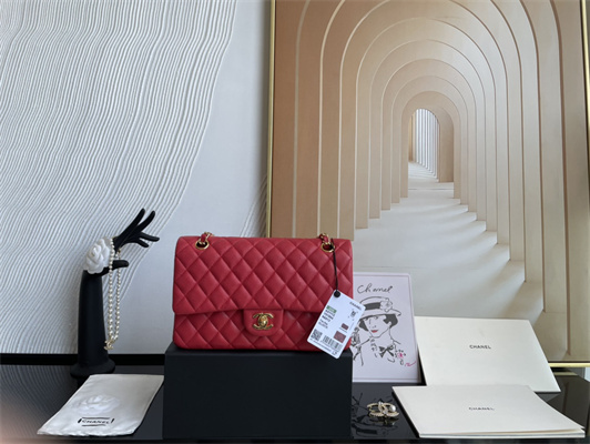 Cha.nel Medium Classic Flap Bag Grained Calfskin Gold Tone Metal Red 01112