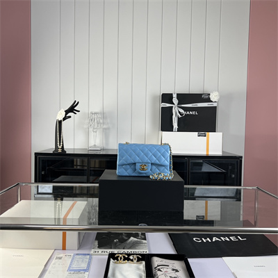 Cha.nel Mini Classic Flap Bag Lambskin Gold Tone Metal Blue 01116