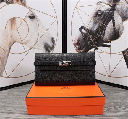 Her.mes Kelly Classic Wallet Calfskin Black Color Silver tone Metal