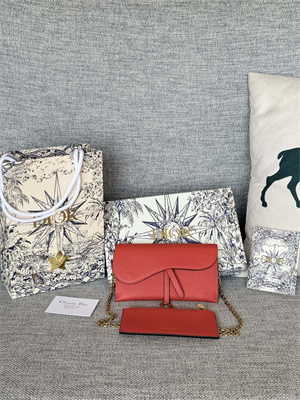 CD Long Saddle Wallet With Chain Grained Calfskin Orange Red