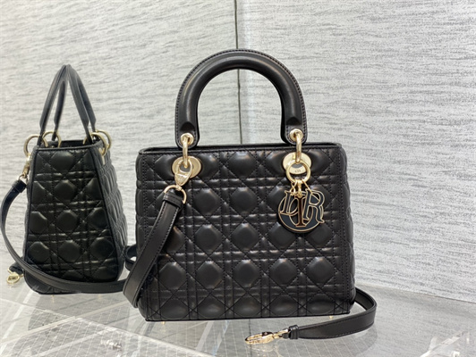 CD Medium Lady Di.or Bag Cannage Lambskin Gold Tone Metal Black